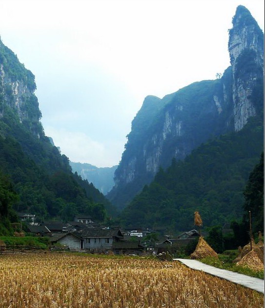 村寨四周山勢雄奇,絕壁夾天;“夯峽”、“九龍”、“玉泉”三溪在這里相會,如同三根彩帶在這里相交結(jié)。這里是風景區(qū)的中心,一萬五千多米長的青石板路從這里一直通向各個景點這里還是一個角度十分好的觀景臺,人立于此,只要原地轉(zhuǎn)動身子,就可觀賞到東西南北全方位的各個景點,那含情脈脈的“相依巖”、昂首奮蹄的“駟馬峰”、惟妙惟肖的“孔雀開屏”五彩繽紛的“彩云壁”和“畫屏峰”……盡在眼中無不景象萬千,令人目不瑕接。詩人石元機贊曰: