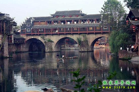 沱江河是古城鳳凰的母親河,她依著城墻緩緩流淌,世世代代哺育著古城兒女。坐上烏蓬船,聽(tīng)著艄公的號(hào)子,看著兩岸已有百年歷史的土家吊腳樓,別有一番韻味。順?biāo)?,穿過(guò)虹橋一幅江南水鄉(xiāng)的畫(huà)卷便展現(xiàn)于眼前:萬(wàn)壽宮、萬(wàn)名塔、奪翠樓……一種遠(yuǎn)離塵世的感覺(jué)悠然而生。沱江的南岸是古城墻,用紫紅沙石砌成,典雅不失雄偉。城墻有東、北兩座城樓,久經(jīng)滄桑,依然壯觀。