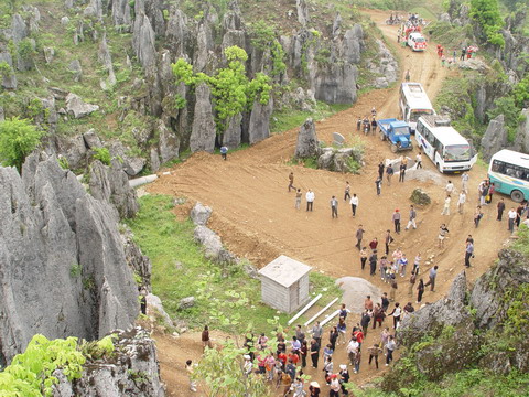 登上洛塔,只見連山綿谷,萬石如林,一塊塊青灰色的大石頭競高競秀,競美競奇,綿亙縱橫,層疊交錯(cuò),造型奇特,塔狀、蓮臺(tái)狀、羅漢狀、錐狀、刀狀、箭簇狀、帷幕狀等林立薈萃,像一個(gè)個(gè)神奇的迷宮,組成洛塔地質(zhì)公園的旖旎景觀。有的玲瓏斫剔,若女繡工鐫;有的嶙峋怪異,如鬼斧神鑿;有的崢嶸巉峻,似水墨丹青;有的嵯峨兀立,藤蔓纏繞,更像一株株挺拔的古樹。高的、矮的、大的,細(xì)的。粗、瘦、皺、滑,各具特色,如人之面目相具而無一相似者,在綠樹紅花間亮麗起一道道迷人的風(fēng)景。洛塔石林遍及整個(gè)山界,較集中的有楠竹車水坪石林、梭洛趙家灣石林、八仙洞石林及公路沿線的銀河塔石林,僅車水坪一帶的石林面積就達(dá)1000多畝。無論其規(guī)模面積,造型及組合情況,洛塔石林都可與云南石林媲美。