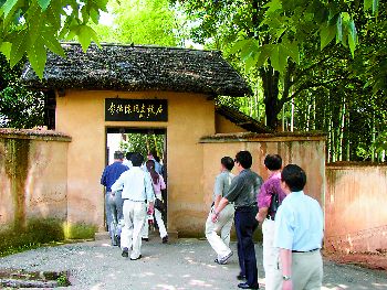 彭德懷故居座落在湘潭縣西南部的烏石寨,距湘潭市約40公里。烏石寨有一座拔地而起,直插云天的險峰,儼然一座高聳的豐碑,它名叫烏石峰。彭總的故居就在這烏石峰腳下。這里竹木蔥郁,土墻圍繞,茅蓋院門,是一棟引人注目的農(nóng)舍。院門兩邊各有一株生長茂盛、果實累累的柚子樹,是彭總在1961年回家時親手栽植的。走過軒敞的三合土地坪,便是正屋。堂屋門楣上,嵌著祁陽石雕刻的橫額門匾,鄧小平同志所書“彭德懷同志故居”七字,金光熠熠,耀眼生輝。堂屋正中,掛著彭總身穿元帥服,顯得十分威嚴而安詳?shù)木薹噬掌?;兩邊墻上,列有他的生平主要活動年表?nbsp;