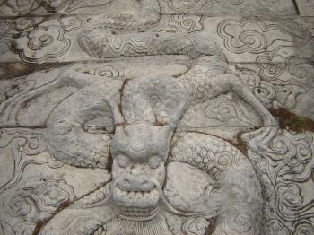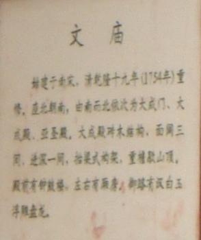 廟前面有學(xué)宮坪,亦名學(xué)坪,坪南端有大明壁。廟宇紅墻黃瓦,氣勢(shì)宏偉。正門曰奎星門,前院左右各植檜樹,常年翠綠,散發(fā)幽香。奎星門內(nèi)有月形泮池,池周護(hù)以石欄。泮池附近有石坊三座,正南石坊匾額鐫有“斯文在茲”四字,東西兩坊貫通街衢。通過(guò)石坊便是大成門。進(jìn)門左右是飛檐綠瓦的鐘鼓亭。大成門通向大成殿,有石鋪甬道直抵大殿臺(tái)基。臺(tái)高一米,全系石塊疊成。臺(tái)階分左右兩道,中有石雕盤龍,綴以云海波濤,栩栩如生,躍然石上。大成殿為歇山式重檐結(jié)構(gòu),周圍有16根圓石柱,內(nèi)外枋、檁、藻井、斗拱、扇梧均五彩施繪,黃瓦飛檐,蔚為壯觀。殿后有亞圣殿,與大成門、奎星門前后襯應(yīng),更顯出大成殿主體的雄偉。