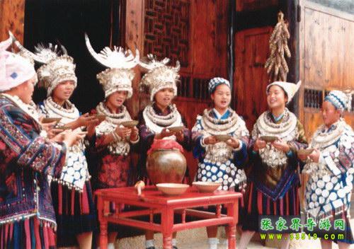 土家人叫槽門,是居住在一個院落里的土家人公用的門。每逢喜慶的日子,都要在這里舉行攔門儀式,以迎接高貴和尊敬的客人。按土家風(fēng)俗,進槽門要對歌喝酒,如果客人對歌能勝,就輕松入門,如客人對歌輸了就得喝攔門酒后入門。喝攔門酒已成為一種迎賓的方式。