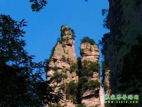 沿田家臺后坡石徑上行約400米,有一座依山而立的觀景臺。站立臺上,見對面200多米處兩峰相依,酷似一堆夫妻并肩而立,五官俱全,面向東南。那峰頂?shù)臉淠净ú萸∷扑麄z的頭發(fā)、頭巾和頭飾,反襯出二人臉面白凈明晰。妻子?jì)尚?,緊傍其夫,低眉含羞,似竊竊私語;丈夫粗狂豪達(dá),眉飛色舞,笑口張開,皓齒畢露,似充滿幸福和滿足。眾多游客觀此景時無不驚嘆稱奇,以致廣泛傳言:觀賞后,新婚夫婦忠貞不渝,老年夫婦煥發(fā)青春,反目夫婦重歸于好。