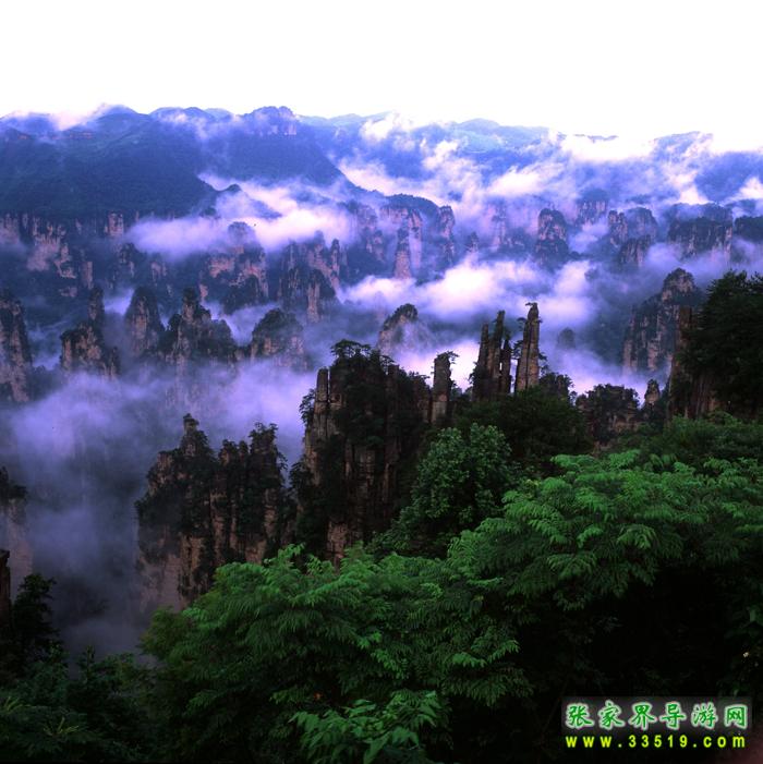 武陵源獨特的石英砂巖峰林在均屬國內(nèi)外罕見,在360多平方公里的面積中,目前所知有山峰3000多座,這些突兀的巖壁峰石,連綿萬頃,層巒疊嶂。每當(dāng)雨過轉(zhuǎn)晴或陰雨連綿天氣,幽幽山谷中生出了云煙,云霧飄緲在層巒疊嶂間,云海時濃時淡,石峰時隱時現(xiàn),景象變幻萬千。霧,使晴日下堅硬的山峰變得妖嬈、飄逸和神秘。觀霧的最好季節(jié)是夏季,天子山是賞霧的最佳去處,也是攝影家常常涉足的地方。