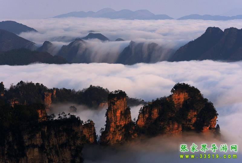 武陵源的春、夏、秋、冬,陰、晴、朝、暮,氣候萬千。云霧是武陵源最多見的氣象奇觀,有云霧、云海、云濤、云瀑和云彩五種形態(tài)。雨后初霽,先是膘朧大霧,繼而化為白云,縹緲沉浮,群峰在無邊無際的云海中時隱時現(xiàn),如蓬萊仙島,玉宇瓊樓,置身其間,飄飄欲仙,有時云海漲過峰頂,然后以鋪天蓋地之勢,飛滾直瀉,化為云瀑,蔚為壯觀。