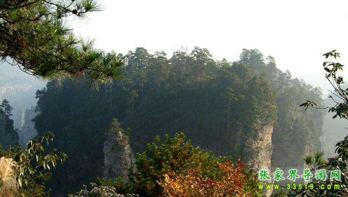 立黃石寨頂東北沿隔澗而望,對面一巖體臺地,高200余米,頂部面積約數百畝,四圍陡峭如削。其上長滿黑黝黝的樹木,借助望遠鏡,可看清有武陵松等,蒼翠蓊郁,猶如綠色迷宮。