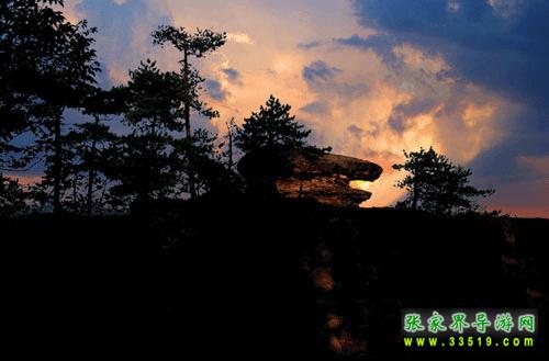 從黃石寨頂西邊下山時,后卡門邊一頂部呈平展臺面的石峰上,一只長約5米的石龜頭部向前,作爬行狀。晴天,龜巖呈金黃色,故稱金龜。氣候的變化又可使其呈現(xiàn)各種不同顏色和形狀,故它又有“霧海金龜”、“金龜探海”、“落日金龜”等幾個別名。