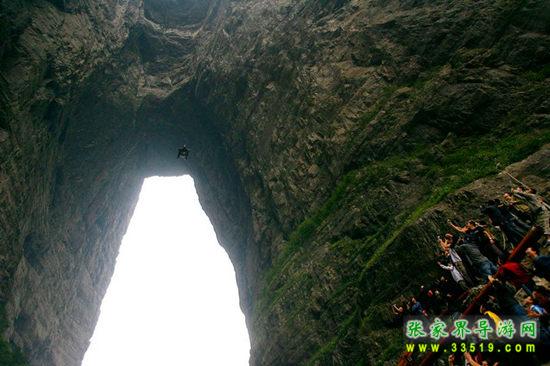 天門洞是天門山最具有代表意義的景點,它位于天門山山體的中上部,海拔1300米,門高131.5米,寬57米,深60米,是世界上最高海拔的天然穿山溶洞。