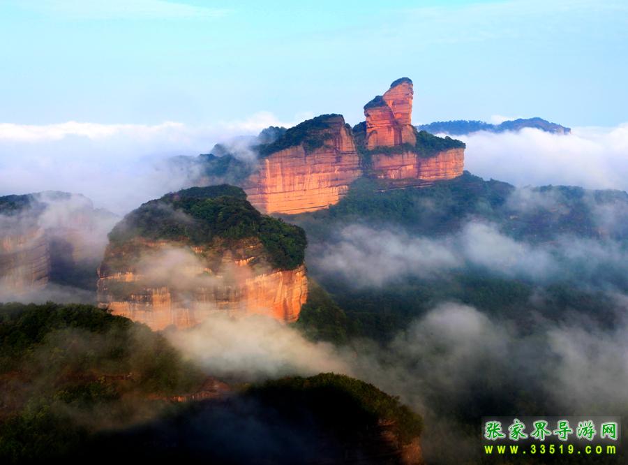由步步高西去數(shù)百米,抵達(dá)“神龜鬧海”景點(diǎn)。憑欄俯視,壁陡谷深,左側(cè)一峰柱頂端不齊,高低處各有一石如龜匍伏。高處之龜體大如盆,仰頭西望,背上有紋理似八卦,其尾高翹,似在爬行。左下一龜較小,似藏頭露尾,畏縮不前。東南50多米處,一堵絕壁的南緣腰間,連接著一塊高大的斷石,斷面上又有一石如龜,翹頭藏尾,似臥沙中。石龜之間有幾根筆立高聳的石柱,石柱周圍是空蕩深邃的山谷。云霧變幻時(shí),山峰時(shí)隱時(shí)現(xiàn),石龜漂浮游弋,靈詭異常。