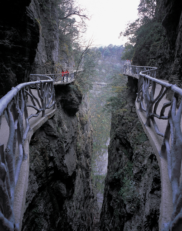 站在棧道上俯瞰群山,古人“會(huì)當(dāng)凌絕頂,一覽眾山小”的感覺油然而生。由于天門山是國(guó)家森林公園,植被特別豐富,加上典型的喀斯特地貌,所以,在這條棧道上更能找到一種在乘坐直升飛機(jī)飛越熱帶雨林大峽谷的感覺,這平時(shí)只能在電影里看到的場(chǎng)景,在這里能讓你身臨其境。