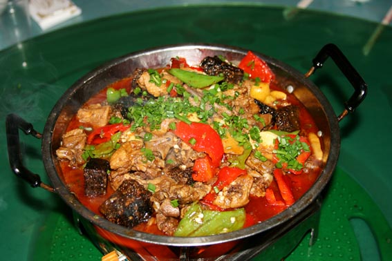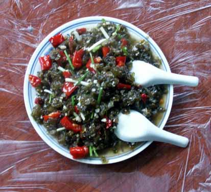 【 酸辣子炒沙蘿菇 】 當(dāng)?shù)卮合募居旰螅筋^巖石壁上生長的墨綠色地菇——地衣(本地名為沙蘿菇),采集后用清水反復(fù)多沖洗幾次。再用壇子腌的酸辣椒和大蒜一起炒熟,出鍋后灑些許香蔥即成一道色、香、味俱全的地方特色小吃。