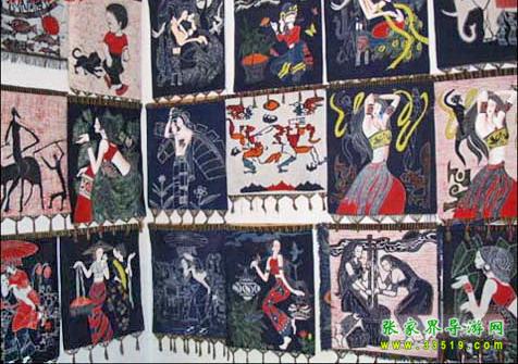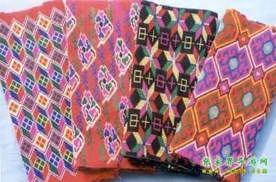 織錦。又名“西蘭卡普”、“土花鋪蓋”,為土家族傳統(tǒng)工藝品之一,是森林公園工藝品廠的主要產(chǎn)品。織錦是在特制的本質(zhì)織機(jī)上以錦紗為經(jīng)、五彩絲線為緯、手工提花織成。以其質(zhì)地厚實、堅韌,色彩鮮艷,格調(diào)古樸,流暢生動著稱。圖案有花草、鳥獸、生產(chǎn)、生活、幾何、字樣等種類。為舊時土家姑娘必備嫁妝之一。據(jù)考證,早在漢代,土家織錦就作為方物貢入漢室宮廷。20世紀(jì)后,土家織錦曾漂洋過海至日、美、英等國展出,并作為禮品,被國家領(lǐng)導(dǎo)人贈送給外國元首及政府官員,如今織錦以壁掛、枕巾、沙發(fā)墊、桌圍、提袋、服飾等多種式樣遠(yuǎn)銷世界各地。