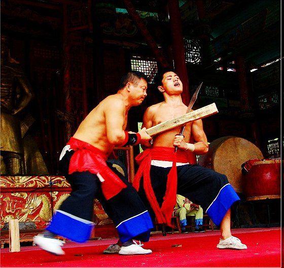 大庸氣,堪稱(chēng)武林奇葩,曾為祖國(guó)贏得聲譽(yù),海內(nèi)外享有極主名望。 大庸氣功是大庸各民族特別是土家族傳統(tǒng)體育項(xiàng) 目之了,分健體氣派、武術(shù)氣功兩類(lèi)。前者有“返還 功”、“馬王推氣功”、“少林達(dá)摩醫(yī)療保健氣功” 等;后者有靜坐、壁虎、靈子、二指彈、碎石、松靜 、硬氣、五禽、五陽(yáng)功等,尤以硬氣功著稱(chēng)。大庸硬 氣功,歷史悠久,漢代相單程,明代覃后,清代劉明 燈,當(dāng)代湯子模、周鐵鞭、杜心武、趙繼書(shū)等都具有 超人硬氣武功。大庸土著民族在漫長(zhǎng)的反征服、反壓 迫斗爭(zhēng),博采武當(dāng)、少林南北派、昆侖派眾家武林精 華,創(chuàng)造出獨(dú)此一家的大庸硬氣功。 據(jù)傳,大庸硬氣功鼻祖是楚國(guó)鬼谷子?!队蓝h 志》有關(guān)鬼谷子隱居天門(mén)山鬼谷洞潛心學(xué)《易》、傳 授方術(shù)的記載。到清代有武林高手朱茂嶺,隱居三岔 村北芭蕉灣洞,研究鬼谷氣功之術(shù),后收西溪坪胡口 子、余世萬(wàn)(即“余通人”)為徙,傳其衣缽。余通 人將武術(shù)氣功系統(tǒng)整理,發(fā)揚(yáng)光大,播名于世。 新中國(guó)成立后,黨和政府十分重視民間氣功發(fā)掘 整理,并正式列為體育項(xiàng)目加以普及發(fā)展,今日大庸 市習(xí)練硬氣功達(dá)數(shù)萬(wàn)人眾。永定區(qū)官黎坪村世有“硬 氣功之鄉(xiāng)”盛譽(yù),該村男女老幼,練功已蔚成風(fēng)氣, 其武師趙繼書(shū),1979年先后參加全省和全國(guó)武術(shù)大賽 ,均獲一等獎(jiǎng),受到國(guó)家體委重視,同年7 月趙繼書(shū) 專(zhuān)程到北京給中央領(lǐng)導(dǎo)同志匯報(bào)表演。嗣后,隨同中 國(guó)武術(shù)代表團(tuán)和國(guó)家領(lǐng)導(dǎo)人先后兩次出國(guó),到盧森堡 、意大利、比利時(shí)、羅馬尼亞、馬其他和東南亞等國(guó) 家訪問(wèn)。他表演的臥刀碎石、頭頂開(kāi)石、雙鳳灌耳、 頭碰石柱、叉尖推磨等精彩節(jié)目,博得外國(guó)友人好評(píng) 。盧森堡一位榮獲國(guó)家獎(jiǎng)牌的武士,看了表演后連夜 來(lái)到中國(guó)大使館,將自己珍藏多年的獎(jiǎng)牌贈(zèng)送給他; 盧森堡國(guó)王主動(dòng)熱情走上臺(tái)與趙繼書(shū)熱情擁抱,連連 稱(chēng)贊:“了不起!了不起!國(guó)際氣功大師!”并把珍 藏紀(jì)念章一枚贈(zèng)送給趙繼書(shū)。一位法國(guó)朋友十分贊賞 說(shuō):“中國(guó)的氣功,稱(chēng)為全人類(lèi)的寶貴財(cái)富,是有科 學(xué)道理的。”自此,大庸硬氣功譽(yù)滿全球。湖南瀟湘 電影制片廠專(zhuān)門(mén)拍攝了彩色紀(jì)錄片《大庸氣功》。 大庸硬氣功共有二十多個(gè)項(xiàng)目,最有影響的是: 腹臥鋼叉 由二人在地面扶住一根叉尖朝上的三 股鋼叉,叉尖猁鋒利,然后一個(gè)俯身叉尖,尖抵腹部 ,待其四肢平展懸空,扶叉二人轉(zhuǎn)動(dòng)鋼叉,謂之推磨 。表演時(shí),要求臥叉者運(yùn)氣于腹,氣意集中,稍有大 意,叉即穿腹而過(guò)。 臥刀破石 先固定兩把大刀,刀口朝上,臥刀者 運(yùn)氣后,由其他人抬臥于刀口上(有仰臥、俯臥兩種) ,然后在臥刀者腹部或背部置一碩大石條(約數(shù)百斤) ,一人或兩人輪大鐵錘狠擊石條直至斷裂破碎為止。 釘?shù)洞财剖?地上倒一層碎玻璃片,一人仰臥其 上;然后腹上置釘床,又一人仰臥釘床上,再于第二 人腹上置釘床,第三人仰臥刀床上,腹部上壓一塊數(shù) 百斤大條石,由人掄錘狠砸,至石破為止。 銀槍刺喉 用一根兩頭安有鋒利槍頭的鋼槍?zhuān)?置兩位表演者喉部,然后相對(duì)發(fā)力,至槍桿抵成彎弓 形而喉部安然無(wú)恙。 徙手?jǐn)嗍?表演者將堅(jiān)滑如鐵一塊卵石置于石凳 (地)上,然后運(yùn)氣于掌或指擊斷(碎)卵石。 踢腿斬石 表演者運(yùn)氣于腿,以腿踢斷石條。一 般可踢斷15公分以上厚度的麻石條或青石條。 胸部打刀 將鋒利大刀刃口置于胸部肌肉上,用 一根拳頭粗木棒猛擊刀背,至棒斷而胸部無(wú)傷。 新中國(guó)成立以來(lái),大庸民間武術(shù)與民族體育逐漸 融為一體,發(fā)揮著提高人民身體素質(zhì)、弘揚(yáng)中華武術(shù) 傳統(tǒng)和增進(jìn)國(guó)際友誼重大作用。除硬氣功外,還有數(shù) 十種武術(shù)形式散見(jiàn)于民間武術(shù)體育活動(dòng)之中。如打飛 棒、扭扁擔(dān)、抵搭斗杠、擠油渣、甩抱腰、舉石鎖、 板牛角(一種斗牛形式)等等。其特點(diǎn)是因地制宜, 不分場(chǎng)地,凡田園地角院壩集鎮(zhèn),都是習(xí)武練功、開(kāi) 展活動(dòng)的處所,頗具泥土氣息。擬或以生活中某些動(dòng) 作和動(dòng)物的某種形態(tài),稍加模仿演繹,便成某一獨(dú)特 武術(shù)形式。如天門(mén)武術(shù)功夫大師余道人所創(chuàng)造的“宮 天梳”、“巖燕樸天門(mén)”等;也有就地理特點(diǎn)創(chuàng)造某 種武功形式的,如“蕩藤”等。