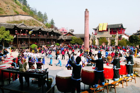 三棒鼓,唐代稱三仗鼓,明沈行符《顧曲雜言》 曰:“吳下何來有打三棒鼓乞錢者,余幼時有見之也, 起于唐咸通中(公元865年)”約于明代傳入本境, 并逐漸成為群眾增聞樂見的民間藝術(shù)形式。每年春節(jié) ,藝人們結(jié)伴走村竄寨拜年,表演對象不分貧富,戶 戶必到。如遇貧寒之家,表演者將別家贈送禮品相送 ,意在人人過節(jié)歡喜。充分體現(xiàn)出土家族人熱情好客 ,心地善良的民族性格,對加強民族團結(jié)有一定作用 。 三棒鼓通常由三至五人組成,一人擊鼓唱詞,一 人鑼鈸配樂,一人?;ò?。花棒三根,長一尺,舞者 左右手各持一根,將另一根拋在空中,左右開弓,擊 打空中花棒使之不落地。也有以刀代棒,以五刀代三 棒的技藝。技藝高強者,突然把刀拋得極高,來一個 眼花繚亂,不禁稱絕。打三棒鼓,通常有“鬧春耕” 、“收割打場”、“慶豐收”、“拜年節(jié)”四套,分 “鯉魚跳龍門”、“玉女穿梭”、“板巖漂灘”等項 目。打三棒鼓技巧性強,表演時需高度集中,用力適 當(dāng),貫通一氣,并與演唱者默默配合。