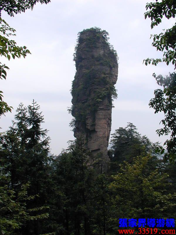 (南天一柱)現(xiàn)在我們前方幽谷峰林中有一高達(dá)200多米的孤峰,宛如擎天玉柱。上部灌木點綴,中部巖身赤裸,下部樹木遮掩,峰體渾圓、偉岸,因立南天門下而得名?!?/p>