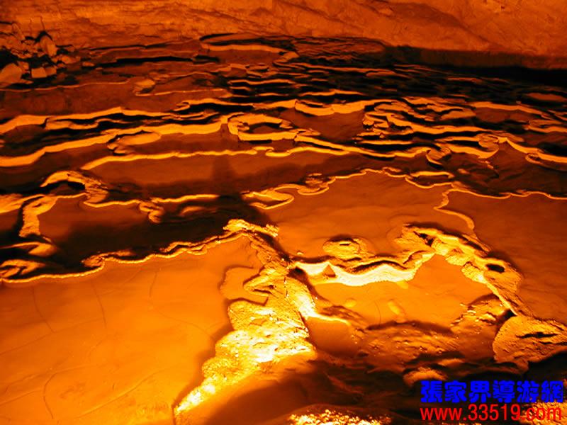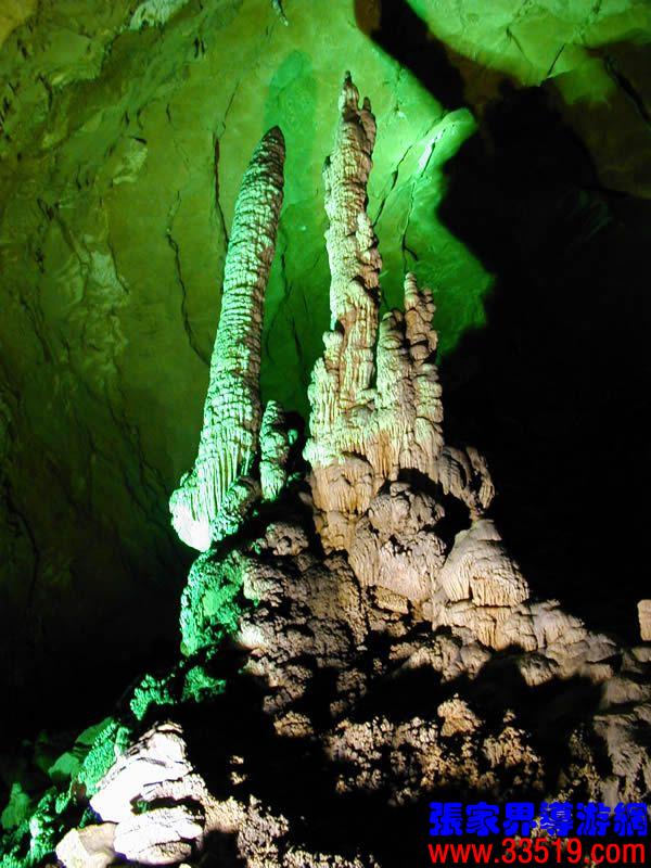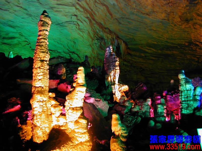 (龍宮)龍宮是黃龍洞十三個大廳中最大的一個,也是景色最美的景點之一,底面積15000平方米,平均高40米,兩千余根石筍拔地而起,千姿百態(tài),異彩紛呈,或如飛禽走獸,或如宮廷珍藏,有的像巍巍雪松,有的像火箭升空。龍宮后園有金銀兩座花池,清水常溢,花簇盛開。宮頂鐘乳柳垂簾掛,四周壁畫栩栩如生。溶解著各色各樣的礦物質(zhì)的水,從巖層中滲透出來,滴落下來。礦物質(zhì)在洞頂凝固結(jié)晶成倒懸鐘乳石,從鐘乳石滴落的水又把礦物質(zhì)澆疊、堆壘在洞底,而長成節(jié)節(jié)向上的石筍。大家看看這龍宮的造型,領(lǐng)略這磅礴的氣勢。洞內(nèi)最大石筍,高12米、直徑10米的漢白玉天然石椅“龍王寶座”居高臨下,眾多石柱石筍似人似物,維妙維肖,圍著寶座朝拜山呼,幾十座珊瑚亭亭玉立,儼然一支龐大的“宮廷樂隊”。湖南著名教授羊春秋先生作《寄生草》詞對此進行描繪:“百態(tài)千姿模樣,三宮六院門巷。龍王開宴設(shè)瓊漿,猴王偷果鬧天堂,君王納寵擁羅帳。搬演了人間爭攘,匯集了天下奇觀。”