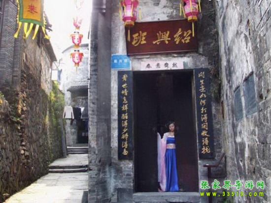 紹興班,位于余家沖,系清代青樓。 始建于清咸豐末年(1860年),是一座四周用封火墻圍護(hù)的木質(zhì)穿斗式的結(jié)構(gòu)建筑,單檐重層,兩進(jìn)三層,各層樓道封閉,分隔有致。各房間置有暗門(mén)。具有極其隱蔽的行業(yè)特征。面闊較寬。有濕天井和干天井兩個(gè)。通風(fēng)采光效果較佳。木窗均有雕花,且式樣各異。地面分別用青石板和杉木板鋪就,房間屋面均用洪油漆刷,整體形態(tài)完好。近作局部保護(hù)性維修;增添了相關(guān)實(shí)物布置和表演節(jié)目,對(duì)游客開(kāi)放。