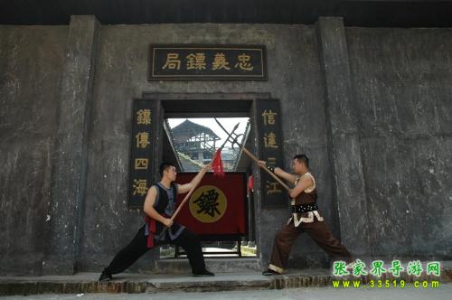 忠義鏢局,它始建于清乾隆四十二年(1777),位于洪江龍船沖,這里會(huì)館、錢(qián)莊、豪宅林立,堪稱(chēng)洪江的曼哈頓。與我們?cè)?a class="insidelink" href="http://www.tielul.com/hongjiang/" target="_blank" title="洪江古商城">古商城看到的窨子屋不同,這是一座典型的北方四合院,前庭后院,布局嚴(yán)謹(jǐn),軸線明確,左右對(duì)稱(chēng),主次分明。前院是鏢師練功習(xí)武之地,墻壁上書(shū)有“忠”、“孝”、“禮”、“義”四字和“十八羅漢練功圖”;后院為鏢師起居和洽談生意之所,內(nèi)供奉關(guān)武大帝。忠義鏢局主要為豪商巨賈押運(yùn)銀票、貨物,看家護(hù)院,坐夜守店,也開(kāi)館收徒,傳授武藝。忠義鏢局的掌門(mén)人劉大鵬,湖南長(zhǎng)沙人,幼時(shí)即入嵩山少林寺習(xí)武,不僅精通十八般武藝,而且頭腦精明,他把鏢局開(kāi)在這洪江最繁華的金融一條街,足見(jiàn)他的經(jīng)商意識(shí)和人面廣了?,F(xiàn)在忠義鏢局現(xiàn)場(chǎng)表演古代押鏢、行鏢全過(guò)程,是人們了解中國(guó)古代鏢行歷史文化的活性博物館。有興趣的朋友可以去洪江古商城親自感受一下當(dāng)時(shí)押鏢的情景吧。