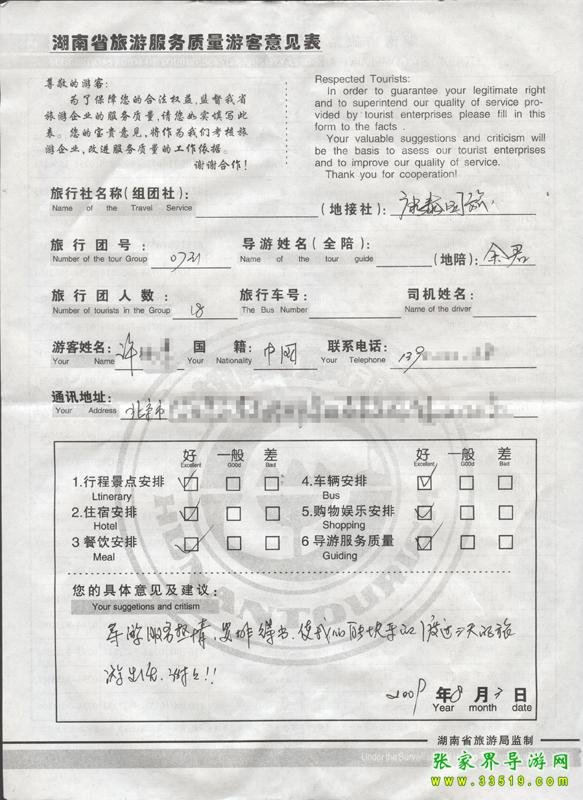 2009年7月31日北京許先生一行18人接待質(zhì)量反饋單: