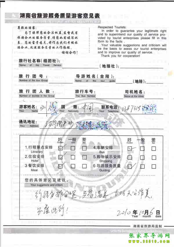 2010年10月6日劉先生一行6位旅游質(zhì)量反饋:行程安排合理,餐宿滿意,不虛此行