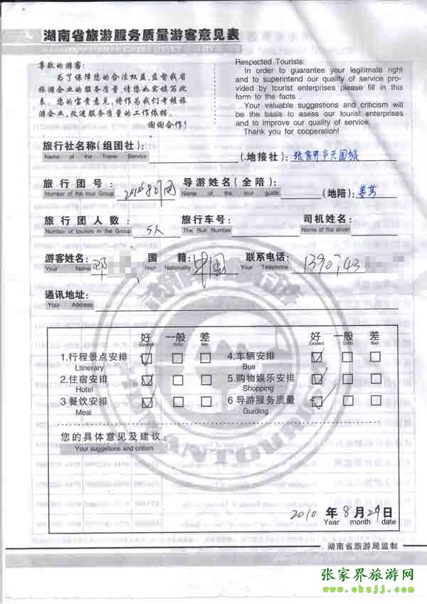 2010年8月29日鄧先生一行5位旅游質(zhì)量反饋